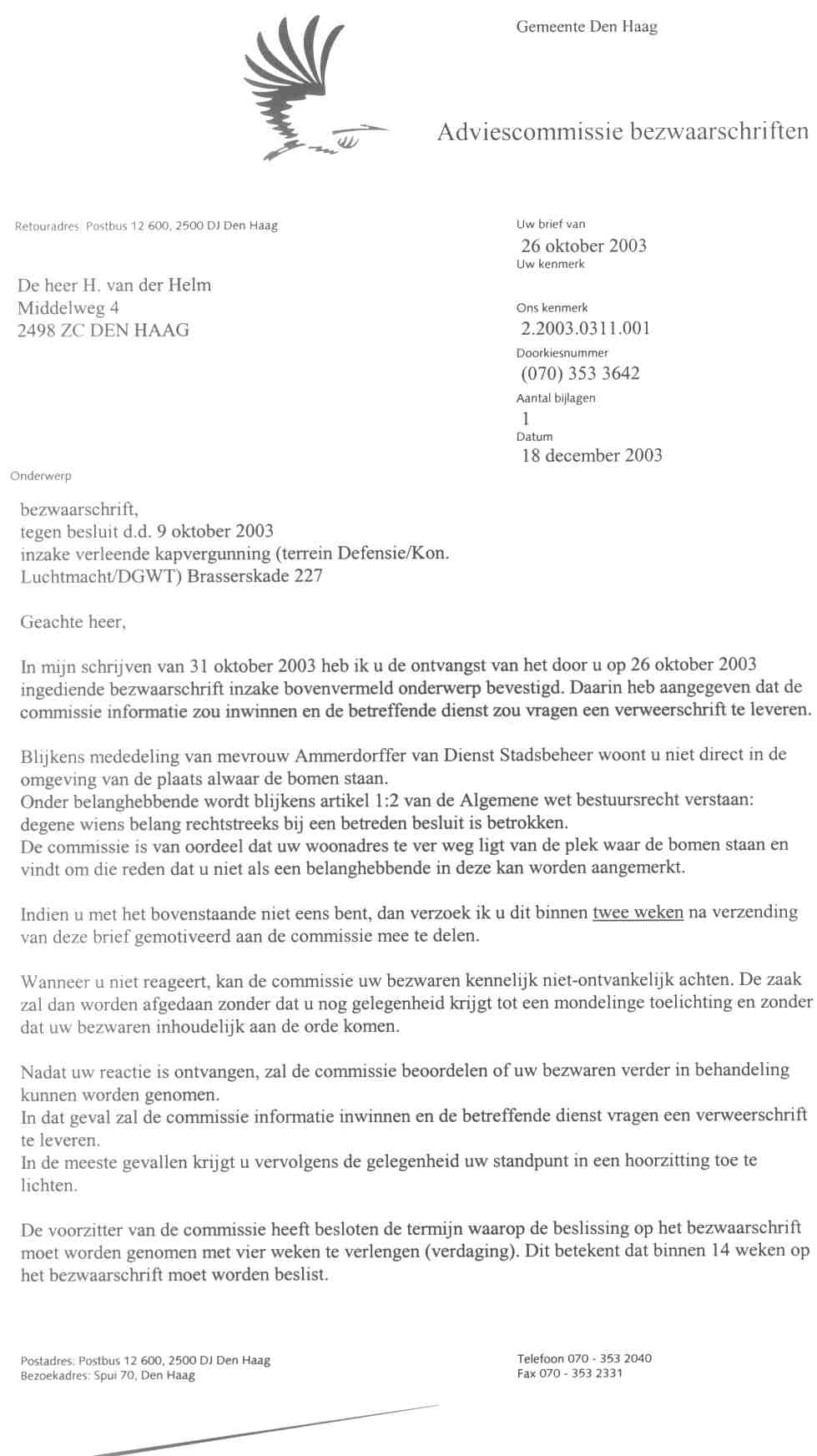 De bezwaarcommisie vindt dat de bezwaarmaker niet-ontvankelijk is, omdat hij te ver weg woont. Hij zou geen belanghebbende zijn volgens artikel 1:2 van de Algemene wet bestuursrecht. Zijn bedrijf ligt echter op een afstand van circa vijftig meter van de bomen. De bezwaarmaker legt dit per brief aan de commissie uit.
